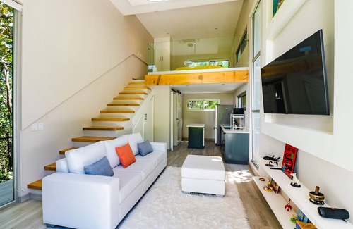 The entire property extends over 3 levels in two separate houses. The first high-end luxury main house features 1 master suite and 1 bath. You will experience scenic Jungle views along with a beautiful suspended infinity pool on the main level. The nearly 1500 sqft space has high-end finishes and is a livable masterpiece that exudes contemporary luxury. The complete floor plan of the property is open and airy with walls of sliding glass that allow perfect indoor/outdoor entertainment and living.