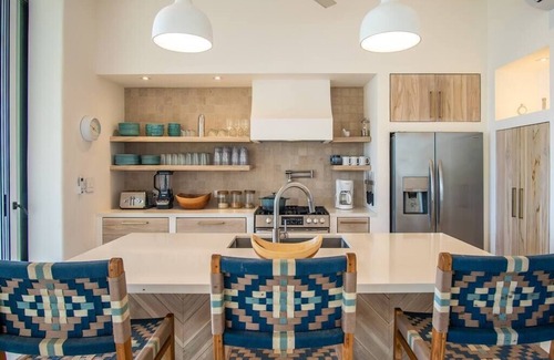 The interior has been expertly curated with natural textures and subtle colors. High quality mattresses and linens ensure a restful night. Plenty of closet space means you can stay organized while you rest. Luxurious spa bathrooms stocked with Turkish bath towels and cotton waffle cloths will reinforce that you truly are in the house of your dreams.