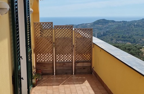 In un tranquillo borgo storico a 4 km dal mare e dalla pista ciclabile della Riviera di Ponente, sulla collina tra Imperia e San Lorenzo, bilocale luminoso con grande terrazzo vista mare e uliveti, dotato di ogni confort, elettrodomestici, tende da sole con comando elettrico. Ampia zona giorno con divano letto 2 posti collegata al terrazzo tramite 2 porte finestra. Camera da letto matrimoniale con ulteriore porta finestra su terrazzo. Bagno finestrato. Posto auto/bici/scooter in garage privato.