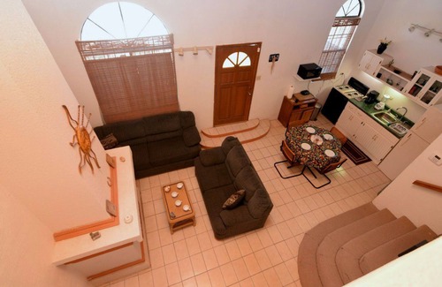 This home features a full kitchen, equipped with all of the necessities you need to make meals at home. Brew coffee in the coffee maker, or put some of your favorite fruits into a blender and create a delicious morning smoothie. The kitchen features a microwave so you can heat up your leftovers from the restaurants down the street, as well as plenty of storage space and an expansive countertop. Keep all of your groceries cool in the updated refrigerator, and keep your family's favorite snacks in the kitchen pantry. This kitchen has everything you need to make meals just like you do at home. Directly off of the kitchen is a staircase that leads to the second level of the house. Grocery shopping for preparing meals is a breeze at either Calimax or Bodega Aurrera grocery stores.