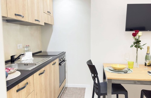 The living area is equipped with a modern and functional kitchenette, complete with an oven, dishwasher and all the necessary utensils for comfortable cooking. A dining table, perfect for breakfasts, lunches and dinners, is located in a well-lit corner. Next to it, a comfortable sofa invites you to relax and, if necessary, easily transforms into an additional bed, ideal for accommodating other people. The living area is also equipped with a TV, so you can enjoy moments of leisure.