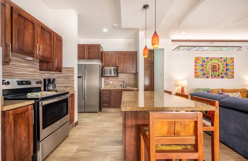 Inside, there are air conditioners and ceiling fans throughout the home as well as extra-large windows for great ventilation and allows for natural lighting to shine in. Our fully equipped kitchen has everything you’ll need to make a home-cooked meal and plenty of space to enjoy it with your group. It’s outfitted with granite countertops and wood cupboards top to bottom providing ample storage. Our open concept living room and each of the bedrooms all open to the large exterior terrace through large sliding glass doors. Enjoy a great night's rest in our three bedrooms, each with super comfortable beds and plush linens.