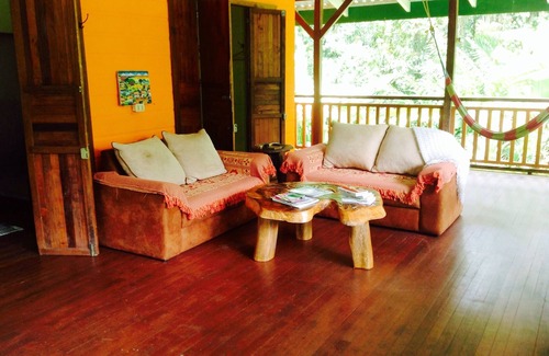 Tres Monos is a simple yet comfortable two story home made almost entirely from beautiful gleaming red Níspero wood. It has two large covered viewing decks with plenty of comfortable chairs, lounges and hammocks to enjoy the brilliant garden and warm tropical air, fragrant with the natural perfume of Ylang Ylang trees and white ginger flowers.