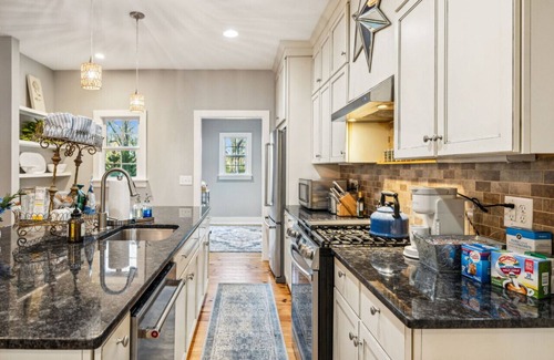 The Farmhouse Kitchen - Our hope is that you treat this as your home away from home. With that in mind we have endeavored to provide all of the amenities & appliances you’d find yourself in need of while preparing meals on the road. From Crock pots & Keurig Coffee Makers to blenders & everything in-between, we welcome you to cook up a feast during your stay. Open to the living room & with space to sit around the island, it is a joy to entertain & gather together here while baking up some cookies!