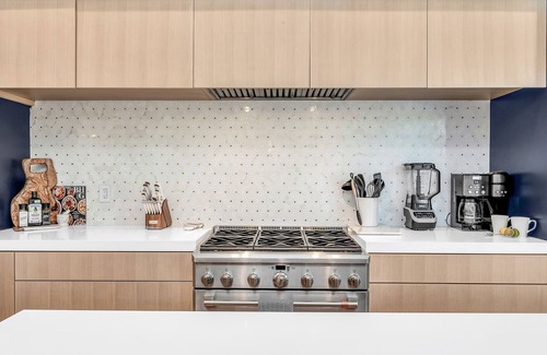 This professionally designed chef's dream kitchen is equipped with high-end GE Cafe stainless steel appliances, custom built cabinetry and a 10’ island. This space is both beautiful and functional. The dark navy walls and intricately designed backsplash with gold inlay add a touch of elegance to the space. Featuring everything you need to whip up a delicious meal, appliances provided include a blender, hand mixer, toaster, combination microwave/steam oven, and Cuisinart dual brew coffee maker. Pop open a bottle of wine with the electric wine opener and pour a glass in the large bulb wine glasses. The kitchen opens up to the pool deck, making it perfect for alfresco dining with outdoor dinnerware and glassware provided. A bar set, complimentary K-cups, expresso coffee, spices, dish soap and sponges are provided. This kitchen is a masterpiece in itself, providing all the tools necessary to create culinary masterpieces.