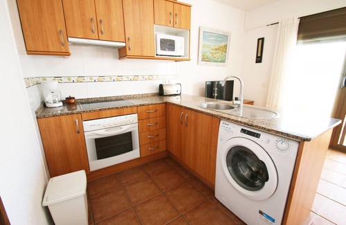 In the open plan kitchen, refrigerator, microwave, oven, freezer, washing machine, dishes/cutlery, kitchen utensils and coffee machine are provided.