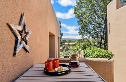 Casita del Mirador is conveniently located in the private residential community of Pueblo Encantado, just minutes north of the heart of Santa Fe. Situated on 95 acres, the community shares access to hiking trails and a seasonally heated pool, while the home's private patio offers al fresco dining spaces, a fire pit, a gas grill, gardens, and stunning views of the breathtaking sunsets and the star-filled sky.