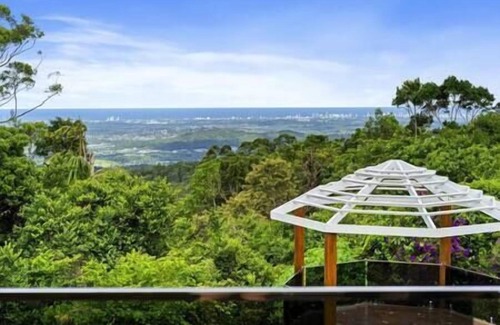 Centrally located, spacious and serene, Central Estate is a large house which boasts a panoramic view of the Gold Coast hinterland and coastline stretching from northern NSW to South Stradbroke Island. Free in-house electric vehicle charging and plenty of car parking on the property. The ground floor features a kitchen which opens to a large living area and deck, taking advantage of the panoramic view. Accessible by a floating wooden staircase, the entire upstairs level features the master bedroom suite, with ensuite bathroom and private, covered balcony looking out to the breathtaking view. In the gardens surrounding the house, a running creek flows gently past a large flowering tree with rope swing. The property features an abundance of citrus trees including orange, lemon, mandarin, and lime.