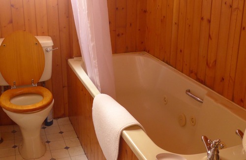 There is a full bathroom with jacuzzi bath and over head shower, wash hand basin and w/c