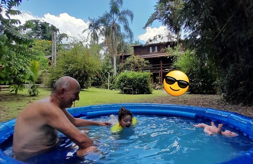Family friendly place to enjoy with the whole family. They say it's a magical place! Rustic and distinctive house "tree house". It was built with every high base, in eucalyptus logs, some 10 years ago, by the family itself. Located on the edge of the Rio Cachoeira, in Antonina / PR. It offers extensive area of balconies, surrounded by juçaras palms and guava trees, as well as other native fruits. One can feel the exuberant nature of the mountain range, overlooking the Paraná Peak.