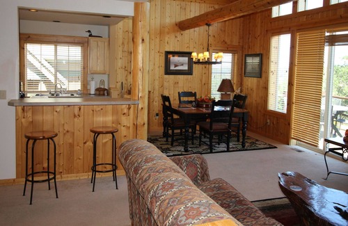 Family friendly chalet at Running Y Ranch Resort with 3 bedrooms, 2 baths. Sleeps 6. Master bedroom has a queen bed and is upstairs with walk in shower and jetted bathtub. There is a loft area upstairs with sofa, reclining chair, TV and a desk area, if you need to work or browse the internet.