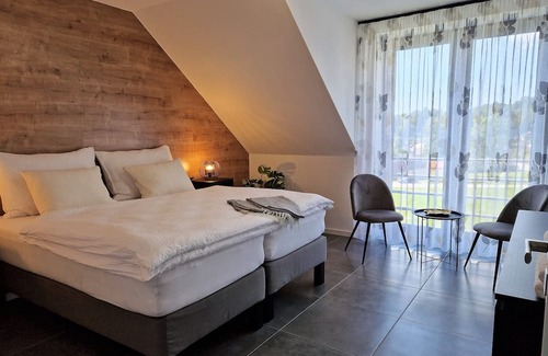 Our apartment, designed with an emphasis on comfort and elegance, offers spacious accommodation for up to 9 people. Four cozy bedrooms, two luxurious bathrooms one with a bathtub and second with shower, a living room connected to a fully equipped kitchen, dining area, and terrace, all thoughtfully arranged for your perfect relaxation. From the large windows, you will be greeted with a breathtaking view of the calm waters of Lipno Lake and the green embrace of Šumava.