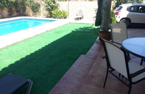 Private air-conditioned villa with enclosed space. Capacity for 5 people, parking, private pool with gardens, porch, solarium, kitchen with pantry, living room, dining areas. Close to restaurants and shops.