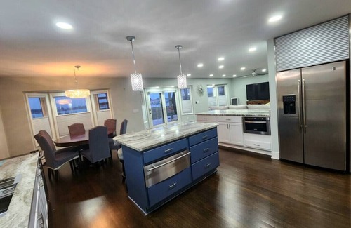 The kitchen is ready for any chef's needs! The entire home is comfortable and welcoming. There is a deck off the master bedroom and a spiral staircase to the lower level from the outside. The dock is 400 feet long and has 110 electricity for up to 3 boats and multiple water toys on either side.