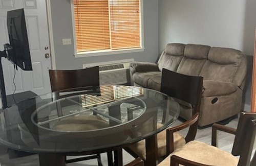 Get ready to relax in this 1-bedroom duplex in Knob Noster, just 3 miles from Whiteman Air Force Base. The space features a cozy queen bed, a full bathroom with a hair dryer with bath/shower unit, and convenient amenities like a washing machine and WiFi. The living room space includes a full kitchen (fully equipped with microwave, stove, full-sized refrigerators, Keurig, and pots & pans), dining area that seats 4, and electric reclining couch and 55" WiFi-enabled tv. The duplex is within walking distance to downtown Knob Noster, just across the street from Belly Down BBQ, our favorite local spot for lunch. Please contact us for extended stay discounts.