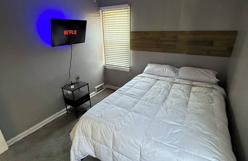 Your Detroit adventure begins at this 2-bedroom house. The lovely property features 2 queen beds, heating, AC, and WiFi. With a cozy atmosphere and all the essentials for a comfortable stay, guests can relax and unwind in this beautiful space. We look forward to hosting you at our place. Free coffee and paid housekeeping available. 65 inch tv in living room….