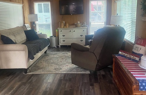This Benton mobile home boasts 2 inviting bedrooms, including 1 queen bed and 1 twin bed. With amenities like AC, heating, and WiFi, guests can relax comfortably. The bathroom features a shower and a hair dryer for added convenience. Enjoy your time in Benton at our fabulous mobile home. Front balcony deck and back deck to relax and enjoy. Lake area close to Sizzling Sisters Resturant.