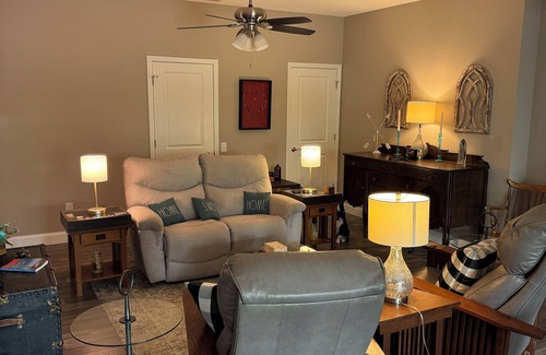 Past 5* Hosts in Seattle WA and Sioux City IA open new home to Guests in Hannibal MO. This offering is for the entire Lower Level of our new, large and centrally located home with easy access to downtown and all area attractions. Two bedrooms, one bath and a large family room, refreshment area, patio and access to the grounds round out this offering. Two large-screen TVs with streaming services and Chromecast provide ample relaxation opportunities. Backing up to a forested tree line adds to the privacy and serenity.
