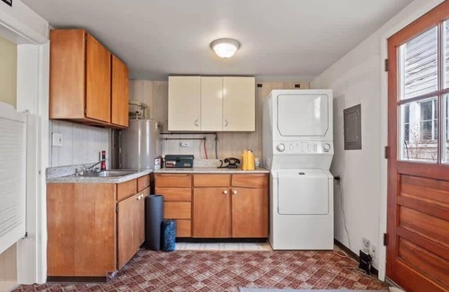 Inside, you'll find cozy bedrooms with plush queen beds, a full bathroom, and a living room with mountain views. The dining room and sunny kitchen with a breakfast bar are perfect for entertaining. High ceilings, tall windows, and vintage details add elegance to the modern design.
