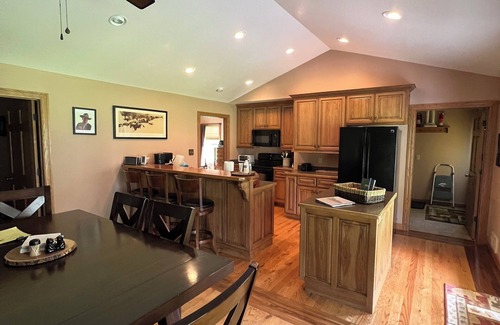 Even though there are restaurants within driving distance, you are able to cook your own meals in the fully stocked kitchen that contains a full size refrigerator, dishwasher and stove/oven/microwave combo unit. You can enjoy your meals either at the custom cut wood slabbed bar that seats 3, or gather around the dining room table that seats 6.