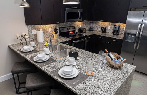 The townhouse comes fully equipped to make your stay as comfortable as possible. The **modern kitchen** is stocked with everything you need to prepare meals at home, giving you the flexibility to dine in whenever you like. A **washer and dryer** are available for your convenience, making it easy to keep up with laundry throughout your stay.
