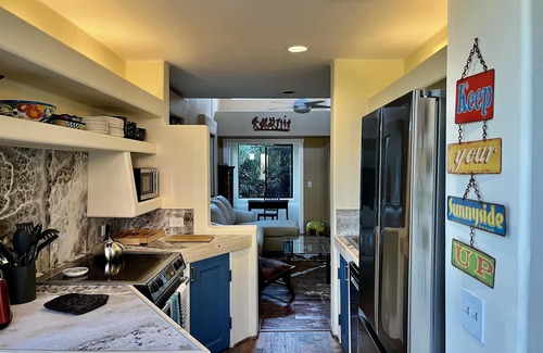 This charming adobe casita is within walking distance to town. The 10,000 sq foot lot is very private, with lush desert landscaping. Enjoy a shady spot on the front patio, sit on the side patio and enjoy the views of the mountains or sit out back by the fire pit for some peace and tranquility. Remodeled through out, while leaving the funky charm, uniqueness & character for your enjoyment. Happy animal art throughout will make you smile!