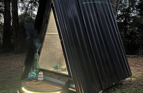 Free gift card. This is a shared property, Guests will have the entire back yard to themselves.Nestled in nature, this custom-built A-frame tiny house sleep capsule exudes tranquility and charm. Its sleek, minimalist design is accented by a cozy porch, perfect for morning coffees or evening relaxation this tiny home offers the modern convenience, power, WiFi, water, ensuring you can reset and recharge in comfort. There is also a fire pit & a separate camping bathroom with an electric heating shower. Furniture can be changed If you just want to come in to slumber let us know we will gladly accommodate.The interior boasts thoughtful décor, including a sparkling crystal light pendant and a striking crystal door knob, adding elegance to the space. Also it has a built in bottle opener.Whether for a weekend getaway or a full-time retreat, this serene tiny house blends natural beauty with luxurious custom touches. make this space yours. cozy bungalow in Ocala with 1 bedroom featuring a full bed.
