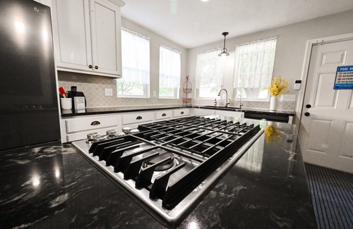 The main level has charming beautiful living room with 65" smart tv, large dining room, fully equipped kitchen with large island and 2 ovens, gas stove, all new appliances. Use the kitchen door to access the backyard with salt water pool, pool house with game table, fridge and plenty of room for entertaining your family!