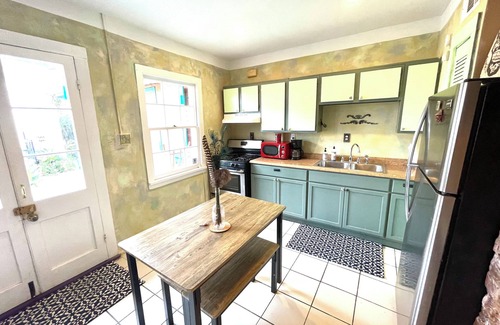Stay in the heart of the Marigny Triangle! Just 2 blocks to the French Quarter and Frenchmen St, the center of the New Orleans local music scene. Our two story guesthouse is filled with old New Orleans Storyville charm with a balcony overlooking our peacful garden courtyard escape. Our home was built in the 1850s, with historic quirks, vintage aesthetic and New Orleans brick dust. It sits behind our main house, making it a quiet private retreat from the bustle of the city. Perfect for a couple, small family or close friends. The layout is open concept, no doors between the upstairs and downtowns, the upstairs has queen bed and a twin bed. Downstairs has a full kitchen, twin day bed and full couch that can become a queen bed. Our neighbohood has resturants within a block, and the Quarter is three blocks away. Sip wine in the courtyard after a long day of sighseeing, Strict cancellation policy observed. No private parking. Artists, open minded travlers and bohemians welcome.