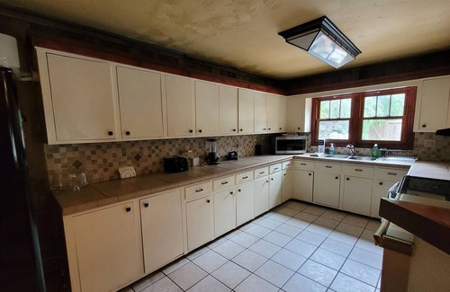 A large vintage kitchen stocked with essentials, tile countertops, and all major appliances