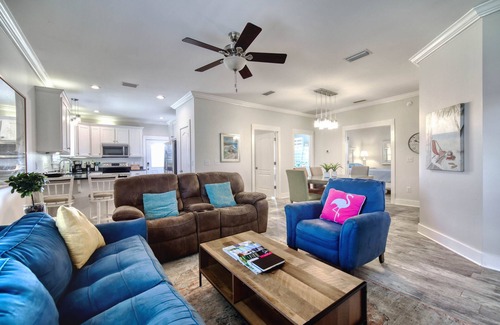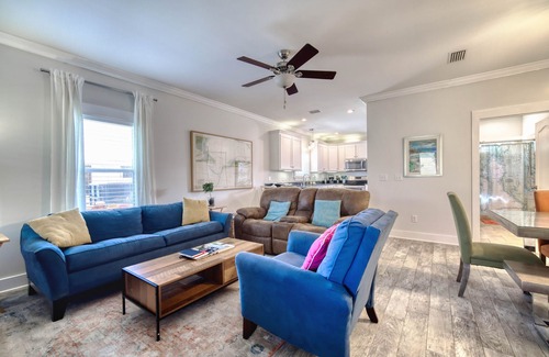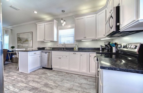The comfortable cottage has all you need for a great vacation. The primary suite has a king bed, a second bedroom with a queen bed, and the third bedroom has dual bunk beds with 2 queen and 2 twin beds.