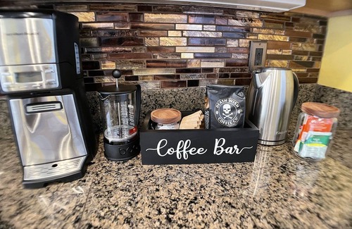 Our open-floor-plan house boasts a fully equipped kitchen, complete with upgraded stainless steel GE appliances, including a double oven. Granite countertops and a spacious island make cooking a pleasure. We've thought of everything, from a blender, toaster, and microwave to a French press, 12-cup coffee machine, electric kettle, and dishwasher. Plus, you'll find utensils for kids, wine glasses, an array of spices, and dinnerware for your outdoor dining needs.