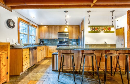 This recently remodeled home offers a warm and cozy cabin feel, creating the perfect ambience for families and couples looking to get away from it all. Here on a quiet cul-de-sac in the heart of Sunriver, you'll be treated to such thoughtful touches as granite countertops, new stainless steel appliances, slate floors, and comfortable leather furnishings. Enjoy use of family-friendly amenities that include a double BOB stroller, a single BOB stroller, a single and double Burley bike trailer, four adult-size bikes, and two kids' bikes to help you get around on the miles of trails that weave throughout the resort. There's even a foosball table in the garage, an outdoor deck with dining space, and a private hot tub for enjoying the beautiful starry nights in Central Oregon.