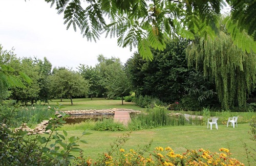 House adjoining the owner's house. Living room with wood-burning stove. Kitchen. Utility room (washing machine, tumble dryer, large refrigerator with freezer compartment, double sink, raclette grill, etc.). WC. Bedroom 1 (double bed) with private shower room and WC. On the 1st floor: Bedroom 2 (1 double bed [hidden]x[hidden] and convertible sofa bed) with private shower room. Bedroom 3 (1 double bed [hidden]x[hidden] and 1 single bed 90x[hidden] with private shower room. WC. Baby bed and high chair. TV. Internet access. CD player and radio. Dishwasher. Sheets and towels for hire. Cleaning service at an additional cost. Electric heating included. All charges included. Private terrace. Shared unfenced grounds. Garden furniture. Barbecue. Deckchairs. Badminton. Parking. Orchard. Lake on site. At the foot of the southern slopes of Avranches, the city of manuscripts, this cottage stands out above all for its lush green park. Designed by the owner, a magnificent landscaped garden awaits you. Whether a lake, an orchard, or undergrowth, these diverse spaces are ideal for strolling and create an enchanting setting for your vacation. Inside, the house is spacious and features a pleasant living room. The abundant wood and the many antique objects found here lend a very warm atmosphere. Didier, the owner, will be happy to introduce you to his many activities as a collector, craftsman, landscaper, and antique dealer. A great introduction to exploring and discovering this magnificent area of Mont Saint-Michel Bay!