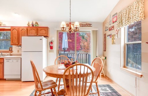 Arrive ready to relax in a rocking chair on the cute covered front porch, glass of wine or cup of coffee in hand. Enter through the front door to a living area with comfortable seating, 55in TV with cable and streaming service (sign in with your own account), electric fireplace. Well equipped kitchen with dishwasher and extendable dining table offer plenty of space for cooking. Step out onto the deck for additional dining space overlooking the private backyard. You might spy deer or turkeys as you look across the yard to the woods. The main level also offers two bedrooms, each with a queen bed with upgraded linens, and a full bathroom with tub/shower combo. On the lower level, the kids will have a blast with a foosball table, an additional TV watching area and a table ready for game night. Toys, a library of DVDs and board games are at the ready. The utility room offers a washer and dryer. The property offers ample off-street parking for up to 4 cars/trailers.