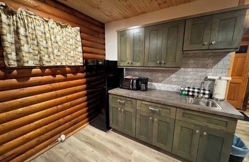 Escape to this charming wildlife themed cabin where you can see lots of wildlife. This enchanting retreat features a cozy open area log cabin with 1 queen bed and 1 sofa bed, perfect for unwinding after a day of exploring. With amenities like central heat and air conditioning, WiFi, and smart TV, you will feel right at home. Kitchenette area features an apartment size refrigerator with freezer, microwave, coffee pot and a nice round table with seating for 4. The bathroom is stocked with all the essentials you need. Covered front porch has a couch and a hanging swing with a huge firepit and free firewood just a few feet away!