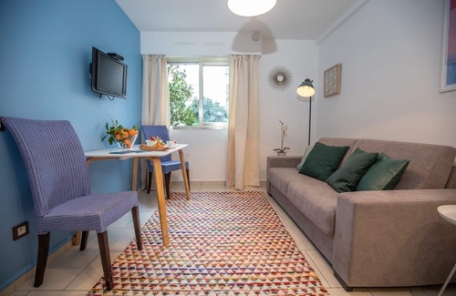 Decorated with a modern yet cosy style by our local interior designers, guests will love the small artistic touches that make this apartment feel like a home away from home. Clean lines, colorful walls, plush furniture and large windows give the cosy space plenty of natural light. A fully equipped kitchenette is perfect for making small meals and the spacious living room is a great place to unwind with a cold drink after a long day soaking up the sun. Premium amenities include free WiFi, cable TV, hotel beds and linens, luxury toiletries, and a Nespresso machine.