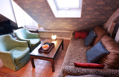 Upon entering this charming apartment which accommodates 2 guests, you will be immediately struck with wonder at the uniqueness and beauty of this sun-filled space. The loft apartment stretches out lengthwise along the front of the building's mansard roof, with ancient roof beams visible throughout and elegant arched windows. The latter provides various cozy spots from which to comfortably observe the Paris streets below and relish your own vantage point.