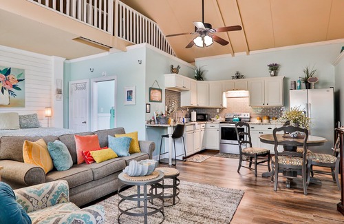 Start the day at the shared, complimentary coffee bar that’s accessible to each home on the property. Inside the charming loft itself, you’ll find a full kitchen with all new appliances, granite countertops, a king-sized bed, and a comfy new sleeper sofa. Stay cool with the window-unit air conditioning or turn on the electric fireplace for a cozy evening. Stream your favorite shows on the smart TV or end the night outside, gathering around the firepit and toasting your good luck at booking such a sweet spot.