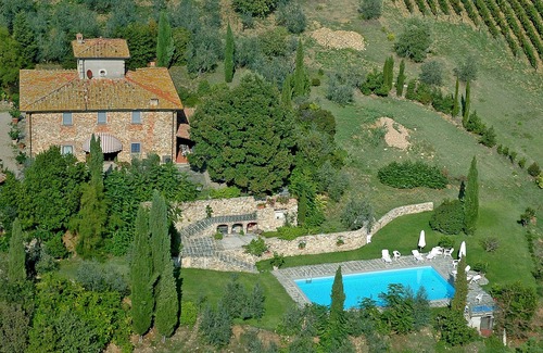 The Villa sits in the Chianti Classico hills among olive groves and cypress trees, just 20 km from Florence. Enjoy beautiful views and a private pool nestled among the vineyards.