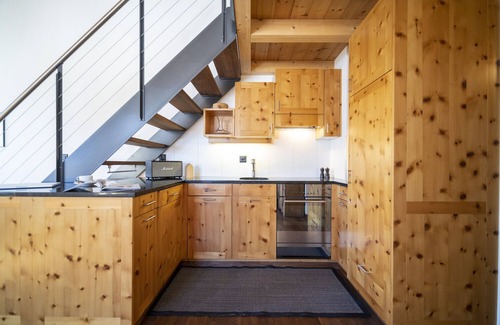 In the stylish two-storey attic flat, furnished with great attention to detail, you immediately feel at home. The use of modern shapes and furniture in combination with Swiss stone pine, the native wood that spreads its own soothing and calming scent, creates an exciting interplay and a lot of warmth. The well-equipped kitchen leaves nothing to be desired. The dining table invites you to enjoy the home-cooked delicacies together. After a busy day, the sunny balcony with a view of the Lower Engadine Dolomites is perfect for an aperitif or a mulled wine. The two bedrooms are furnished once with a double bed 180 x 200 and once with a bunk bed with two single beds 2x 90 × 200. Two bathrooms allow everyone to start the day calmly in the morning. One is equipped with a bathtub and WC, the second one on the upper floor with a shower and WC. A garage parking space is at your disposal. The lift takes you from the garage and the ground floor directly to the flat.
