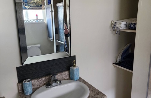 The fully equipped kitchen has what you need to prepare meals and dine-in. There are a few notable extras— filtered water, ice maker, coffee pot; full-sized washer and dryer, hot water kettle, microwave, and toaster are included. The dining table seats four but there are dishes and silverware enough more.