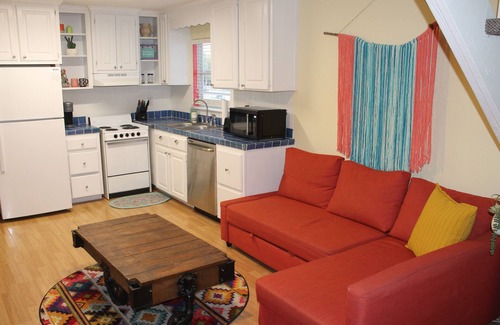 Located in a small row of beachy townhomes, this unit is a private 1-bedroom apartment that is charming and cozy. When you walk up the stairs to the home, you'll see the private patio with seating for 2 and a sun umbrella. Inside, the décor welcomes you in with it's vibrant colors and cozy atmosphere. The living room, dining area, and kitchen are on the lower level, with the bedroom, bathroom and closet upstairs.