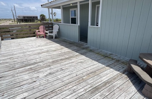 Cheniere Landingis on the water, featuring a private boat dock with water access for fishing or crabbing. It has three bedrooms, two bathrooms, and sleeps six. Enjoy a nice view of the water from the uncovered sundeck. Downstairs is a concreted area with a picnic table for hanging out while grilling or boiling with family and friends.