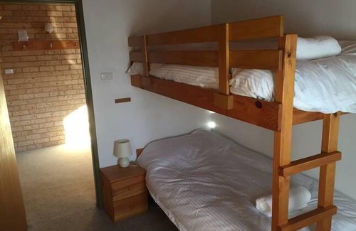 Large one bedroom unit with a queen bed and one set of bunks. Two bathrooms. Fully self contained kitchen with dishwasher lounge room and wood fire (firewood supplied) large Smart TV free internet.
