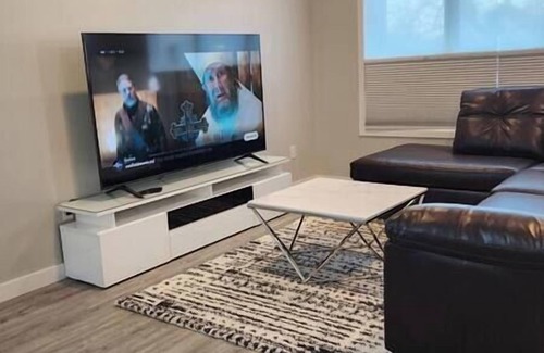 This cozy suite features a living room with a 75 Inch LG HDTV with Netflix and Youtube, full leather sectional. The dining area is adjacent to the living room, and the kitchen is fully equipped with a full-size stove, microwave, blender, toaster, and more.