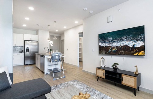 Relax in the expansive living area, furnished with a generous 65-inch flat-screen TV, or settle in for some productive time at the serene and well-appointed workstation. The bedroom offers a cozy retreat, featuring a plush bed for your utmost comfort and an additional TV for your entertainment needs. Thanks to its open layout, the space is filled with natural light, creating an inviting atmosphere that's perfect for unwinding and recharging. Reserve your stay now and immerse yourself in the epitome of contemporary living!!