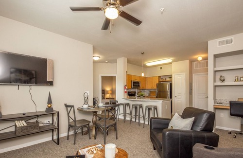 Whether you’re here for work or play, come home from a long day to plop onto the couch, kick your feet up, and watch a movie on our 50” SMART TV featuring complimentary Netflix. More of a movie in bed kind of person? We have 32” SMART TVs set up in both bedrooms for you to turn on your favorite film and fall fast asleep. Staying here means gaining access to the condo complex’s many amenities, including a pool, fitness center, indoor communal spaces to meet with friends, BBQ/picnic area, and a dog park for your furry friend. So have yourself a swim, cook up some hamburgers, and hang out in style!