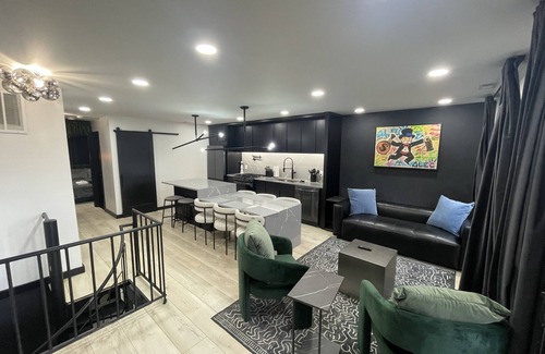 The home’s interior is a welcome contrast to the rugged landscape of the outdoors, offering contemporary furnishings and sleek, modern décor in open spaces that promote connectivity and relaxation. Unwind in the living room on plush sofa or armchair seating while you keep up with episodes of your favorite shows on the smart TV. The chic fireplace is as much form as it is function, creating the perfect ambiance for an immersive movie night. The fully equipped kitchen is a chef’s delight offering all-black appliances, glossy stone countertops, and ample cabinetry stocked with cookware and dining ware. Gather around the dining area offering seating for 6 for formal meals or a spontaneous game night alike. The balcony offers the perfect quiet spot for your morning coffee as you soak in the fresh air and wooded surroundings. Should the group’s entertainment preferences differ, head downstairs to discover a second attractive living area complete with comfy sofa seating, mounted smart TV, fireplace, and a kitchenette.