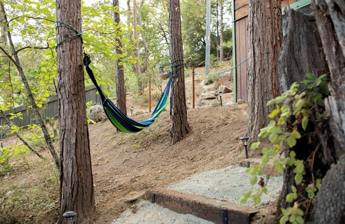 The nature filled back area of the property has an outdoor bathroom, deck, and 2 additional dwelling units, one with queen bunkbeds and private deck, the other is a hype dome with clear panels and an epic view giving a more intense and intimate nature experience.